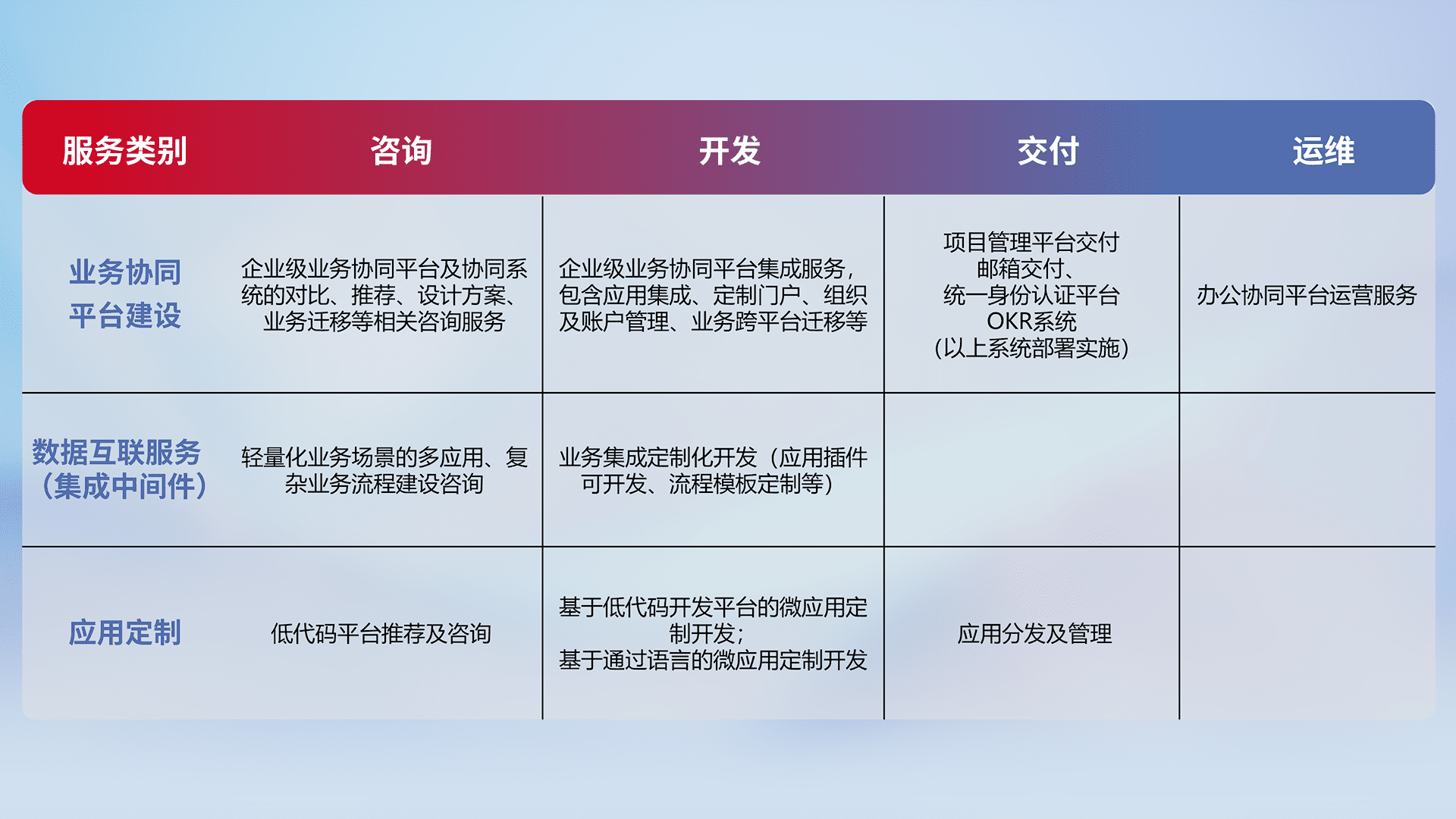 针对钉钉、、企微、、、、IDaas等平台级产品提供产品的规划、、方案、、、交付、、、定制化开发等服务,,,,实现如统一协同办公、、智能客户服务、、混合会议管理、、智能数据查询、、、等业务场景,,,,实现数字化转型。。。。